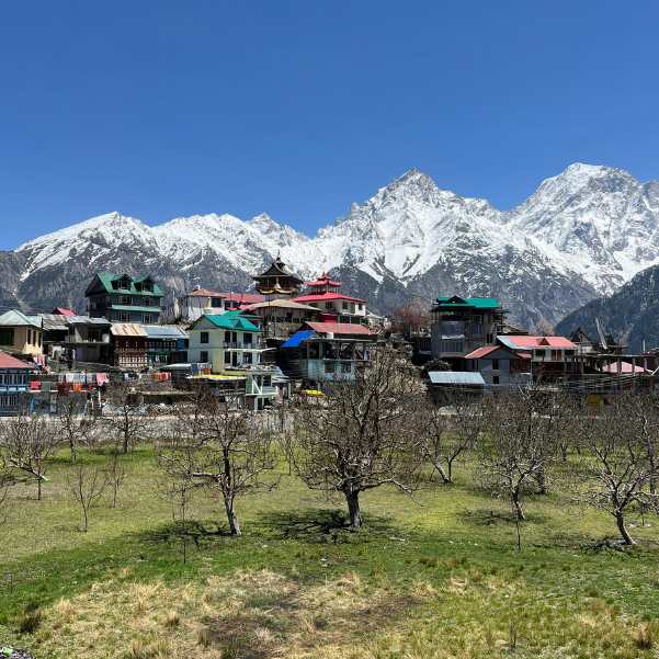 November is early winter. The crowds disappear, the orchards are bare, and the Kinner Kailash views with fresh snow are extraordinary.